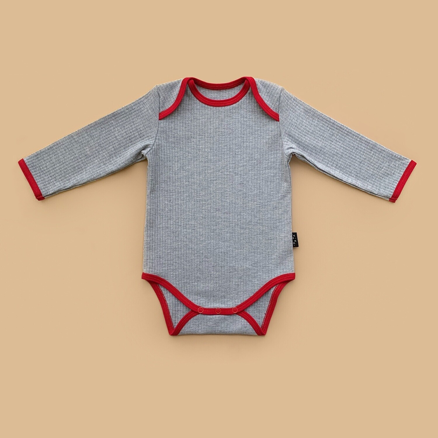 - Боди серого цвета с длинным рукавом и контрастной отделкой красного цвета